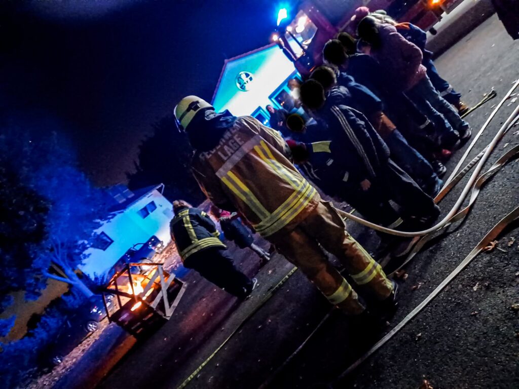 Im Gerätehaus „dem Wohnungsbrand“ mussten vermisste Personen gefunden werden. Ein besonderes Ereignis ist immer wieder, wenn die jüngeren Gäste, unter fachkundiger Anleitung selbst einen kleinen Brand löschen können, auch das durfte an diesem Abend natürlich nicht fehlen, und so brannte auf dem Hof dann tatsächlich ein kleines Feuer.